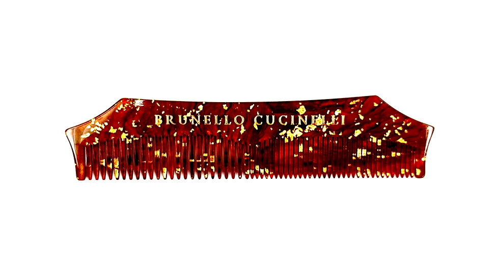 Born from three sheets of cellulose acetate, fused together to hold delicate gold flakes, this comb was conceived as a tribute to Brunello Cucinelli, a name that stands for vision, integrity, and enduring refinement.